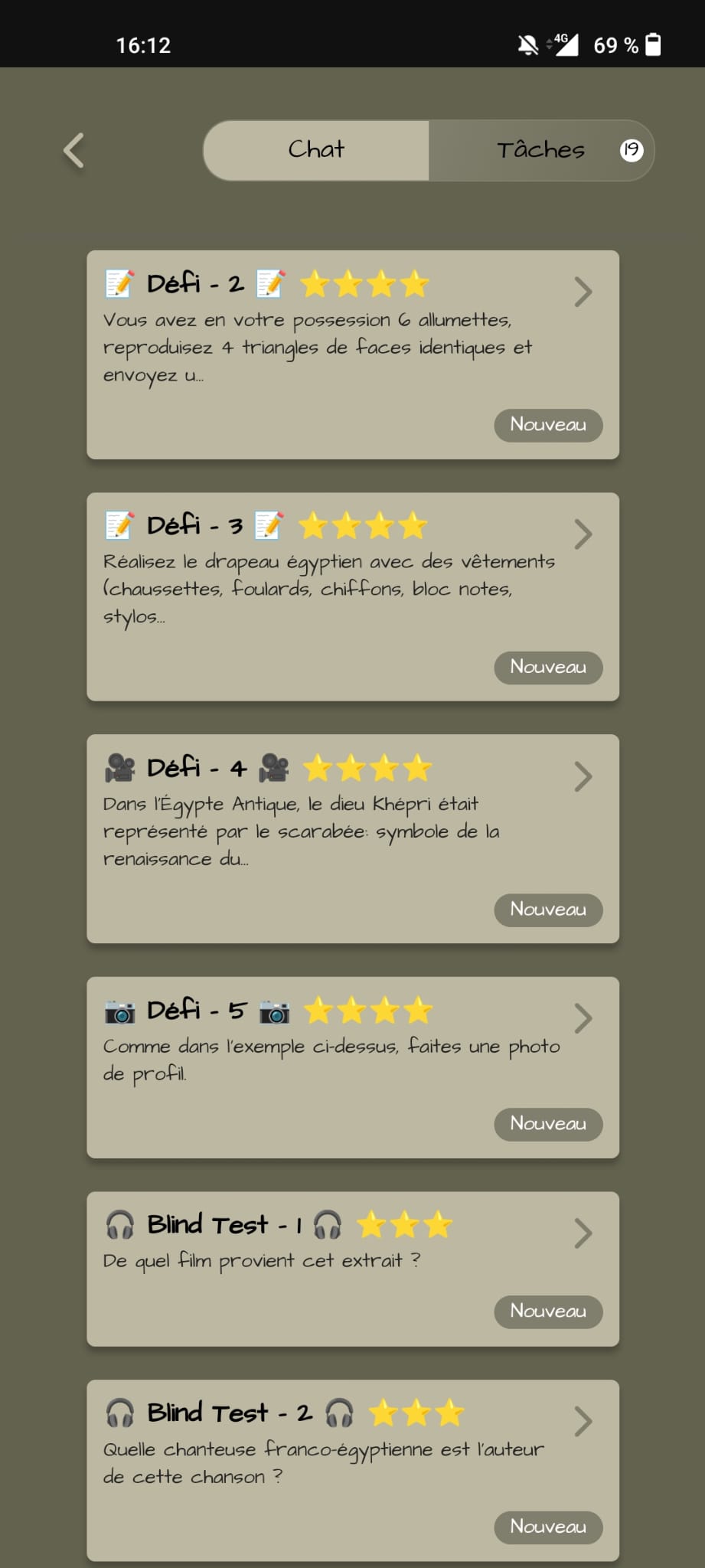 Le Principe : En équipe, réalisez un « parcours » divertissant via une application permettant à l’équipe de remplir, selon les objectifs de la rencontre, les défis sur le thème du voyage autour du monde ou aux goûts de l'Egypte. Les défis sont divisés en : challenges photos et vidéos, énigmes et questions de culture générale. Pour chaque épreuve, des points sont accordés aux équipes par le game master. La créativité, la culture, la vitesse de résolution des équipes sont récompensées.